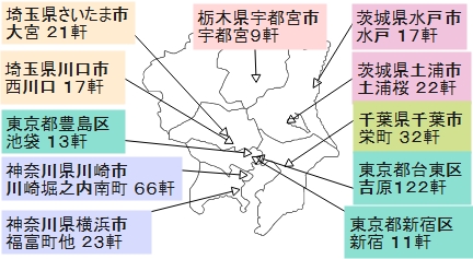 浅草:1軒 吉祥寺:1軒 東府中:1軒 八王子:1軒